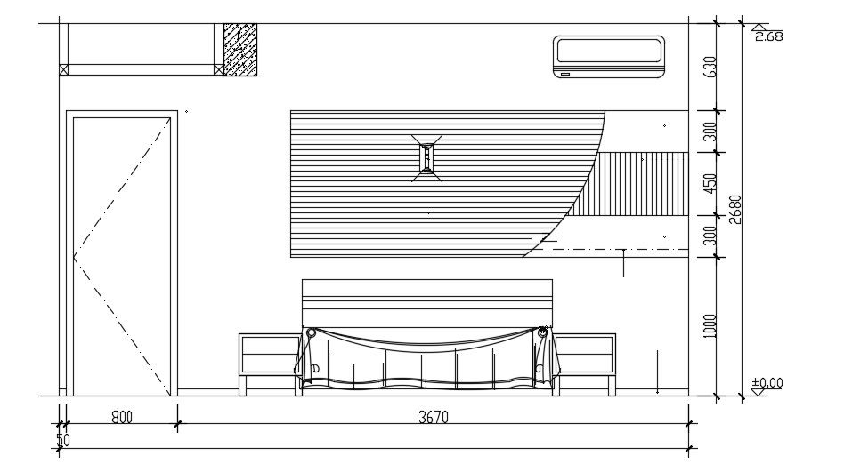 Front elevation design of bedroom that shows furniture blocks details of a double bed, AC unit, door blocks details in the room along with room dimension working set details download CAD drawing for free.