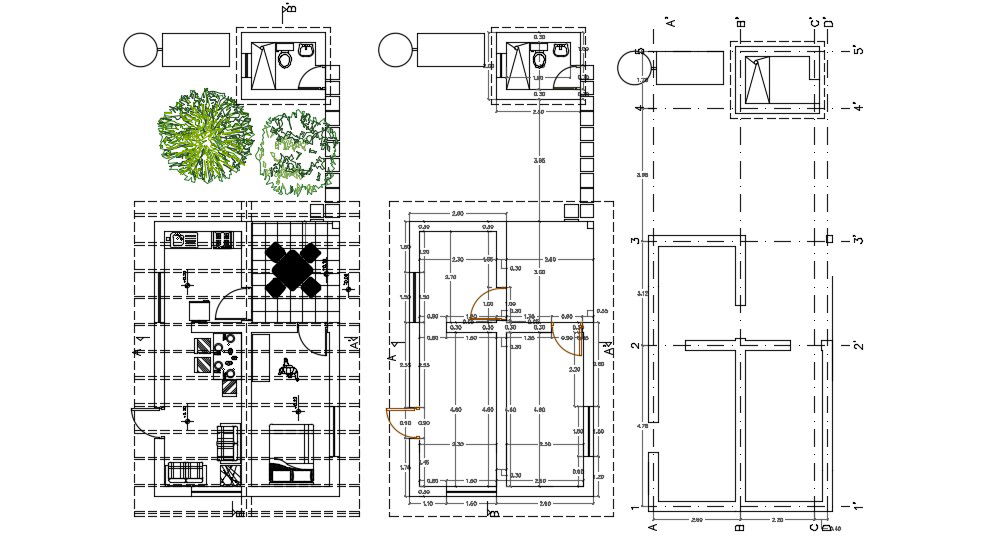 House center line plan design that shows house working set dimension details along with wall arranegemnt design details house furniture layout details also included in CAD drawing.