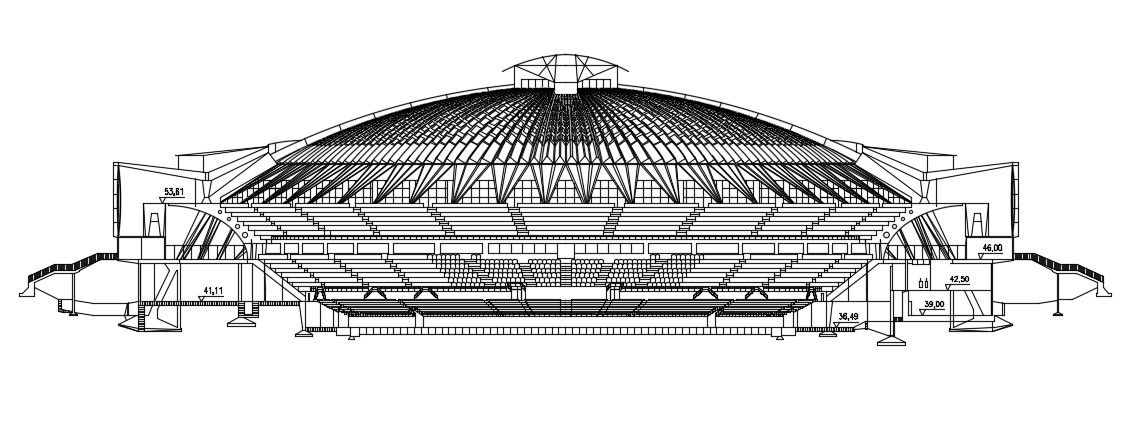 Stadium Seating arrangement design that shows front elevation design of seating details along with roof shade details download CAD drawing for detailed drawing.