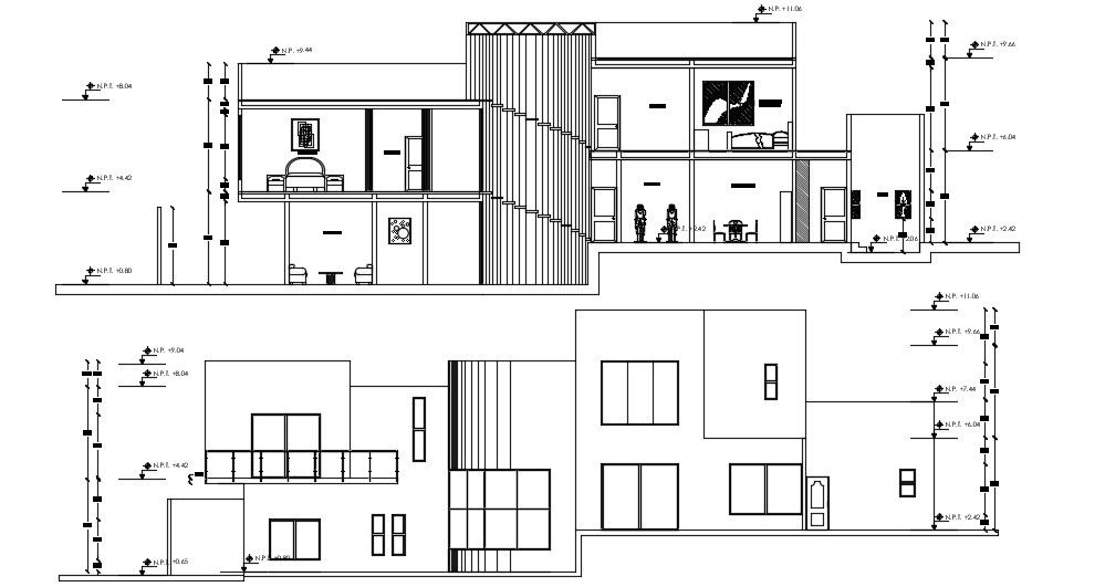 Contemporary Bungalow Elevation, Section AutoCAD Drawing File Free; detail of bungalow elevation, a section with leveling CAD file free.