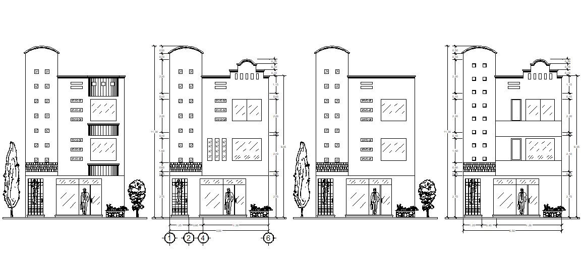 CAD drawing details of hospital building different sides of elevation that shows building front elevation side elevation and rear elevation details download file for free.