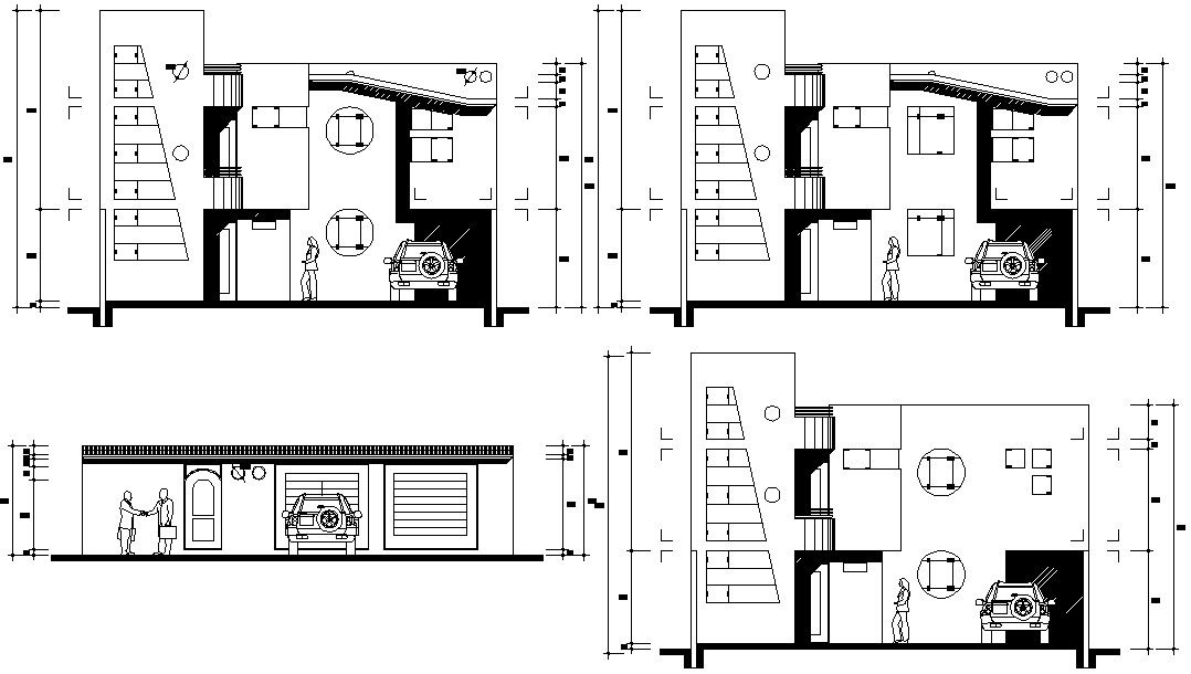 CAD drawing details of a residential bungalow front elevation and rear elevation design download file for free.