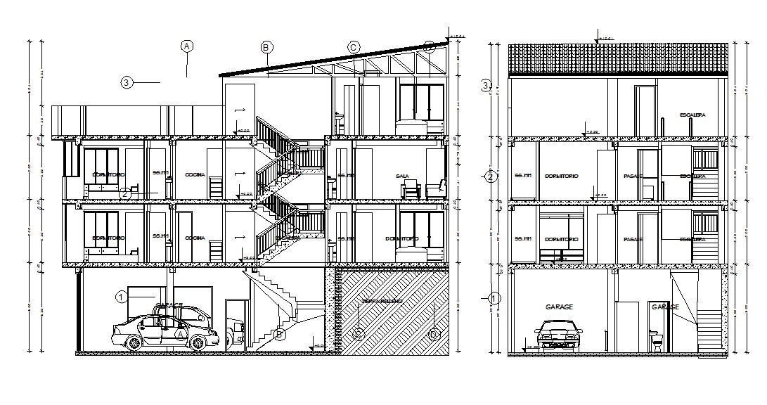 Sectional design of Apartment that shows building and each floor height details along with a garage, parking space, roofing structure, staircase, and various other details download CAD drawing for detailed work.