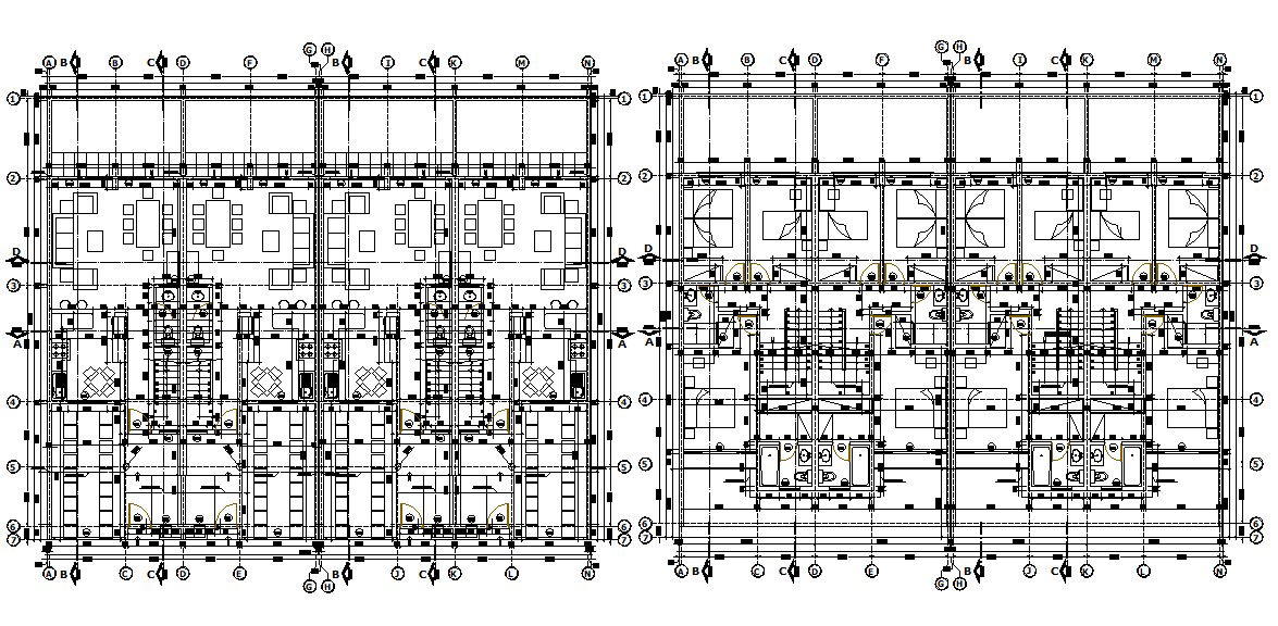 CAD design of a residential furnished apartment plan that shows working set dimension details, floor level details, room details, center line plan, section line, and various other details download file for a detailed work plan.