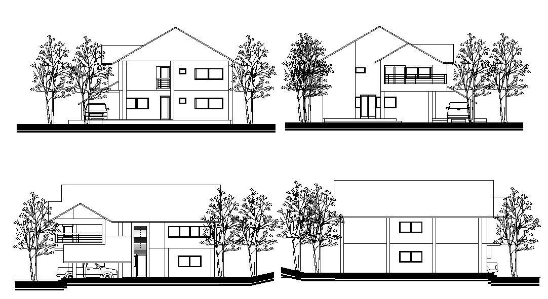 Apartment different sides of elevation design that shows bungalow front elevation side elevation and rear elevation drawing download CAD file for free.