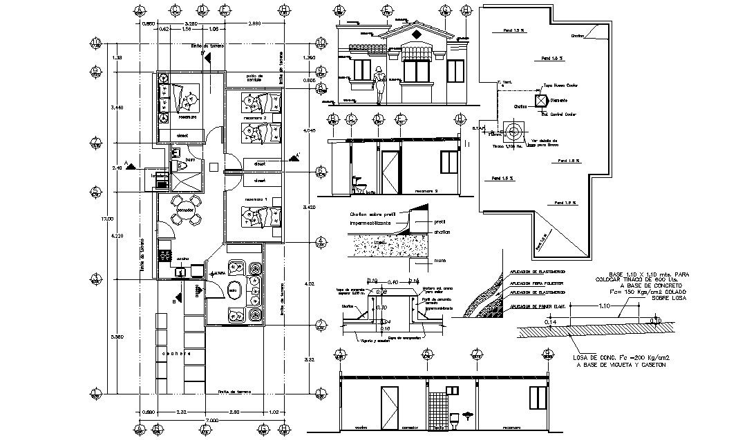 CAD drawing details of residential housing bungalow that show furniture blocks details of the house along with working set dimension, bungalow front elevation, section design, and various other details download the file.