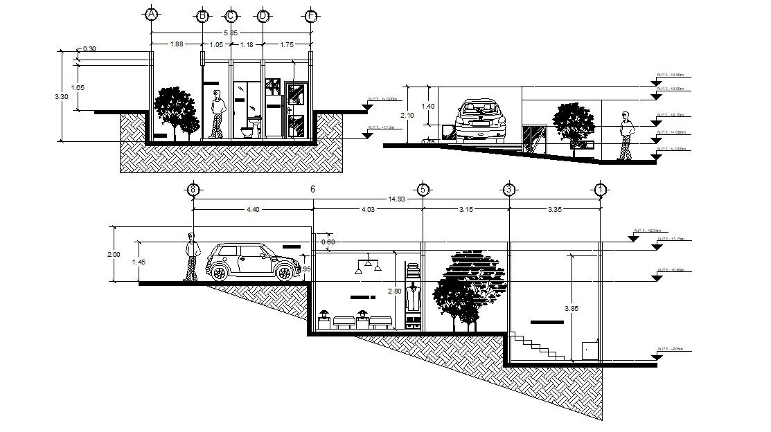 CAD drawing details of residence house section file that shows single story house design along with leveling details, building height, furniture units, and various other details.