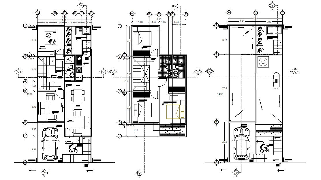 G+1 residential bungalow design that shows furniture layout details in a bungalow along with dimension working set details, staircase, floor level, parking space, and various other details in house download CAD drawing for detailed working drawing.