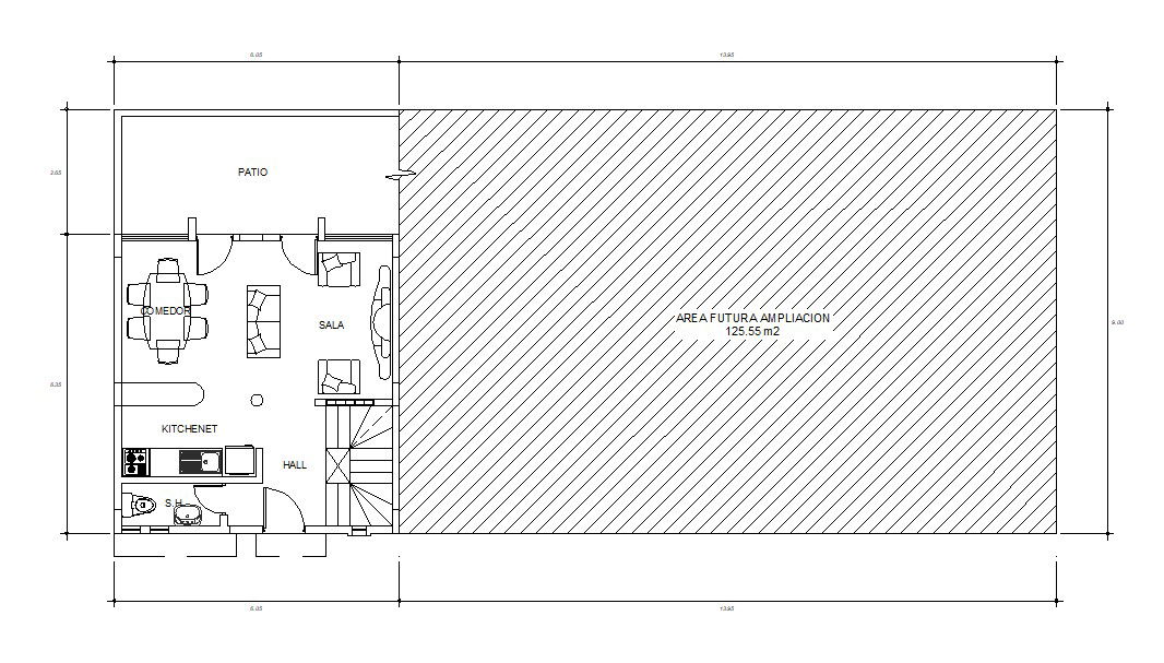 Furnished house ground floor plan details along with future development 125.55 m2 area details, area working dimension set, and various other details download CAD drawing for free.