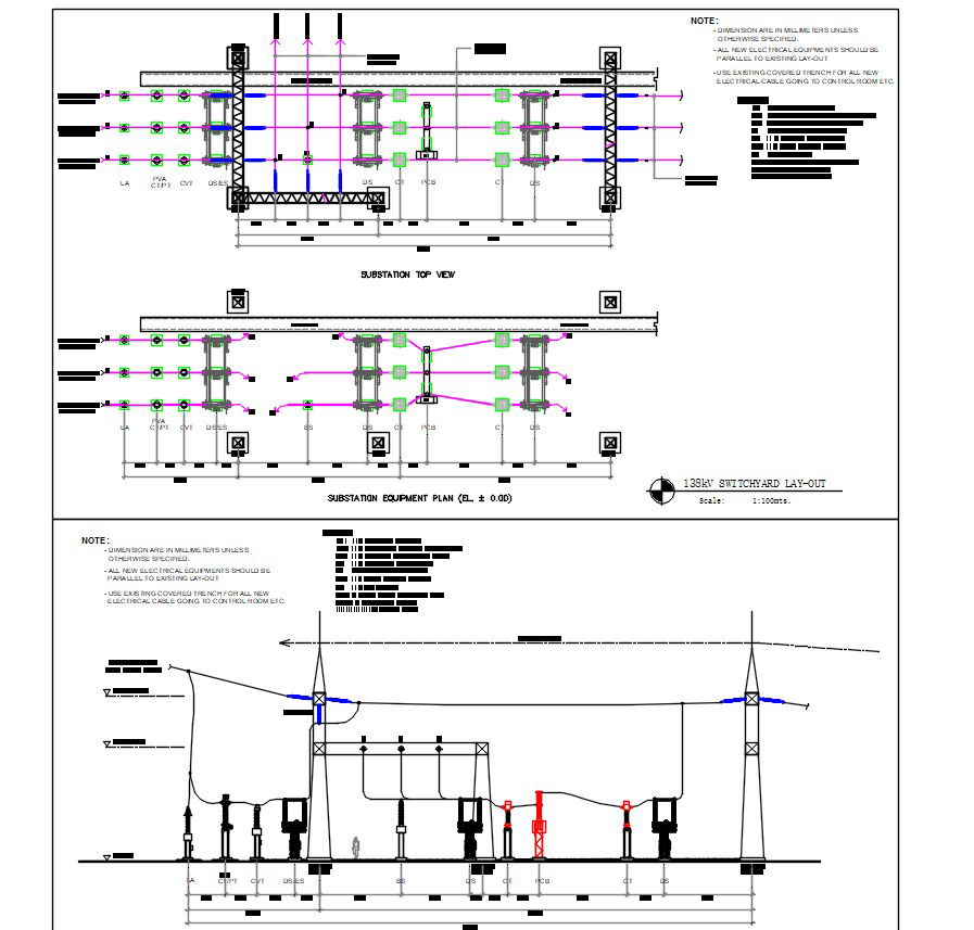 Switchyard Elevation Plan DWG File; A Switchyard layout plan elevation drawing shows the location of various outdoor equipment in an HV/EHV switchyard, working and safety clearances among them.