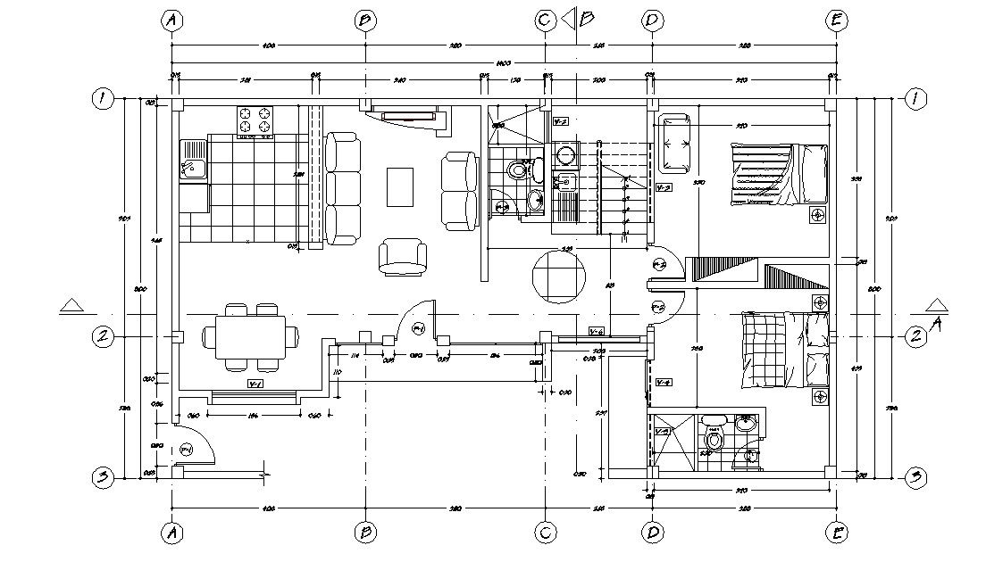 Furniture Layout details in residential House ground floor plan that shows room details of two-bedroom, kitchen and dining area, living room, sanitary toilet and bathroom details in the house along with working dimension set, section line details download CAD drawing.