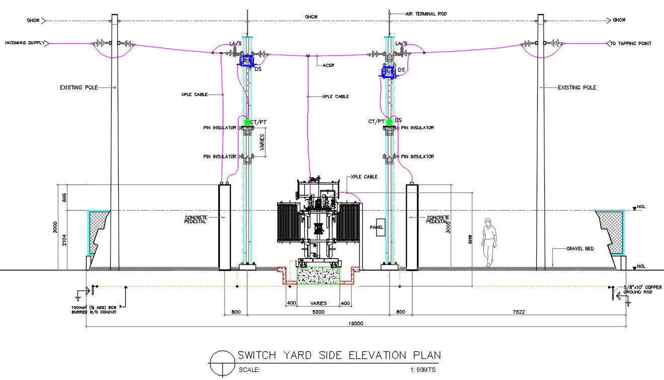 SwitchYard Side Elevation Plan Autocad file; A Switchyard layout plan elevation drawing shows the location of various outdoor equipment in an HV/EHV switchyard, working and safety clearances
