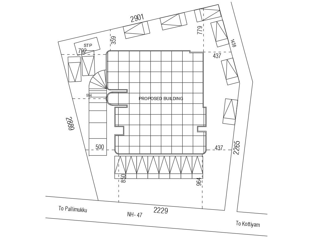 Building Purpose Plan DWG File; 2d CAD drawing of building built-up area purpose plan with compound wall and road detail.