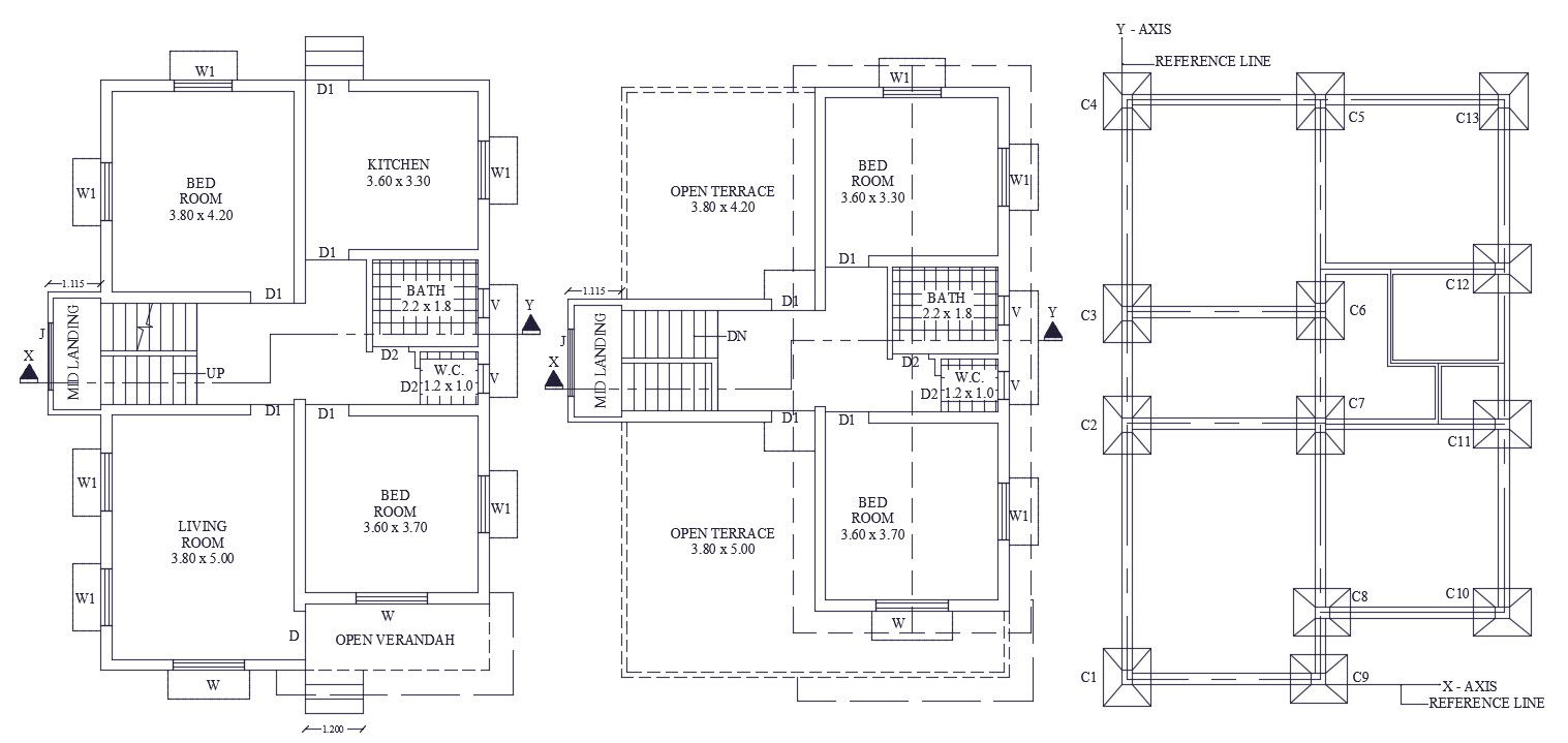 House And Foundation Layout Plan DWG File; the house-building ground floor, first floor and foundation layout plan includes 4 bedrooms, kitchen, living room, open terrace with measurement detail. download DWG file and use it for CAD reference.