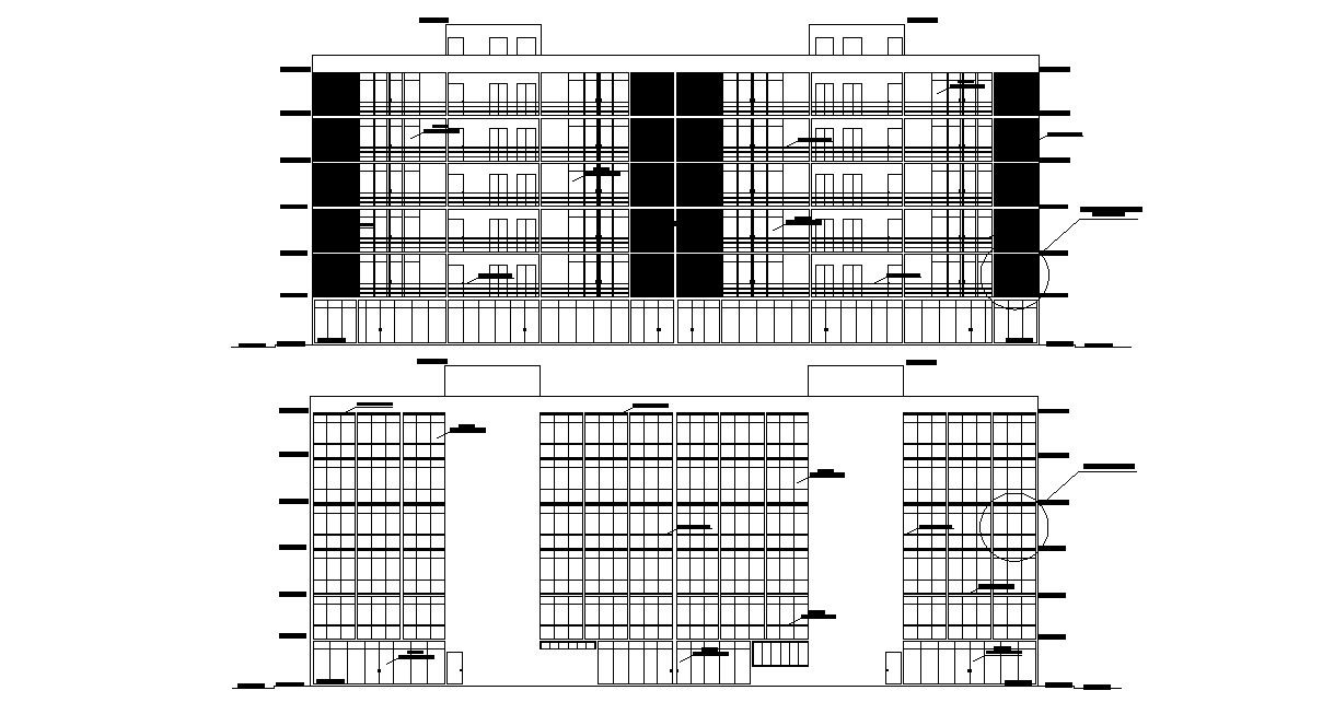 Residential apartment design Different sides of elevation drawing that shows building front elevation, side elevation and rear elevation design along with building height details download CAD drawing.