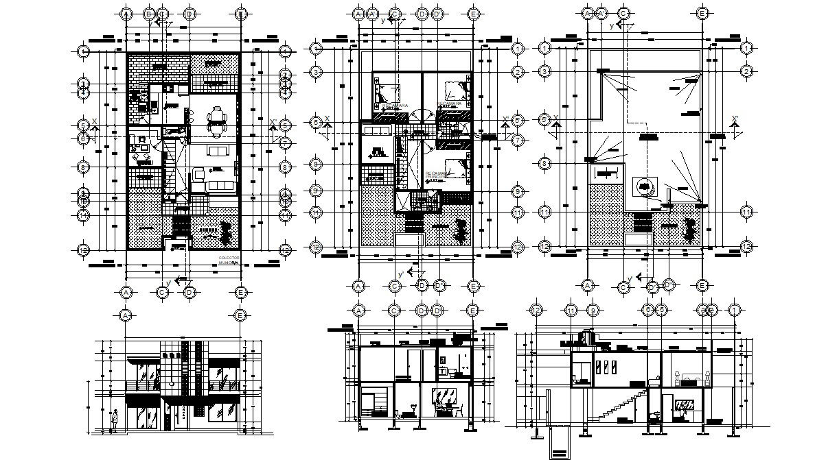 Furnished Bungalow Floor plan details that show room details in the house along with section line details, room dimension, floor level, terrace plan details, house different sides of elevation and sectional design download CAD drawing for detailed house design.