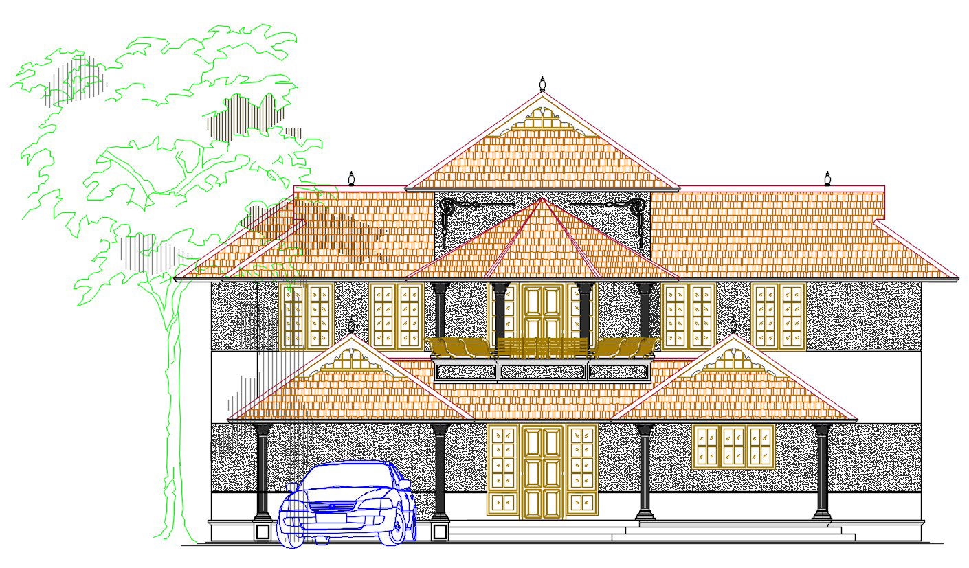 House Front Elevation CAD Drawing; download DWG file of 2 storey house building front elevation design shows wall design, roof material, door and window.