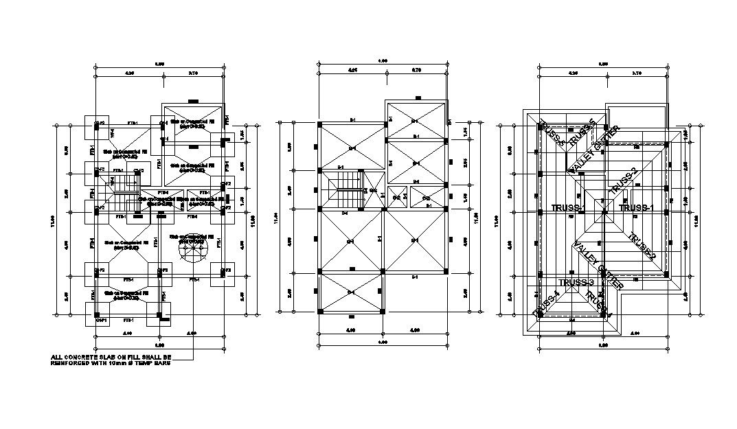 Column footing structural plan details along with column beam plan details of the building, steel truss plan, dimension working set, reinforcement bar dimension, and various structural blocks details download CAD drawing.