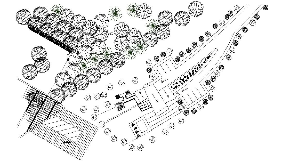 Residential house plot design plan that shows existing house details along with area landscaping details download CAd drawing for free.