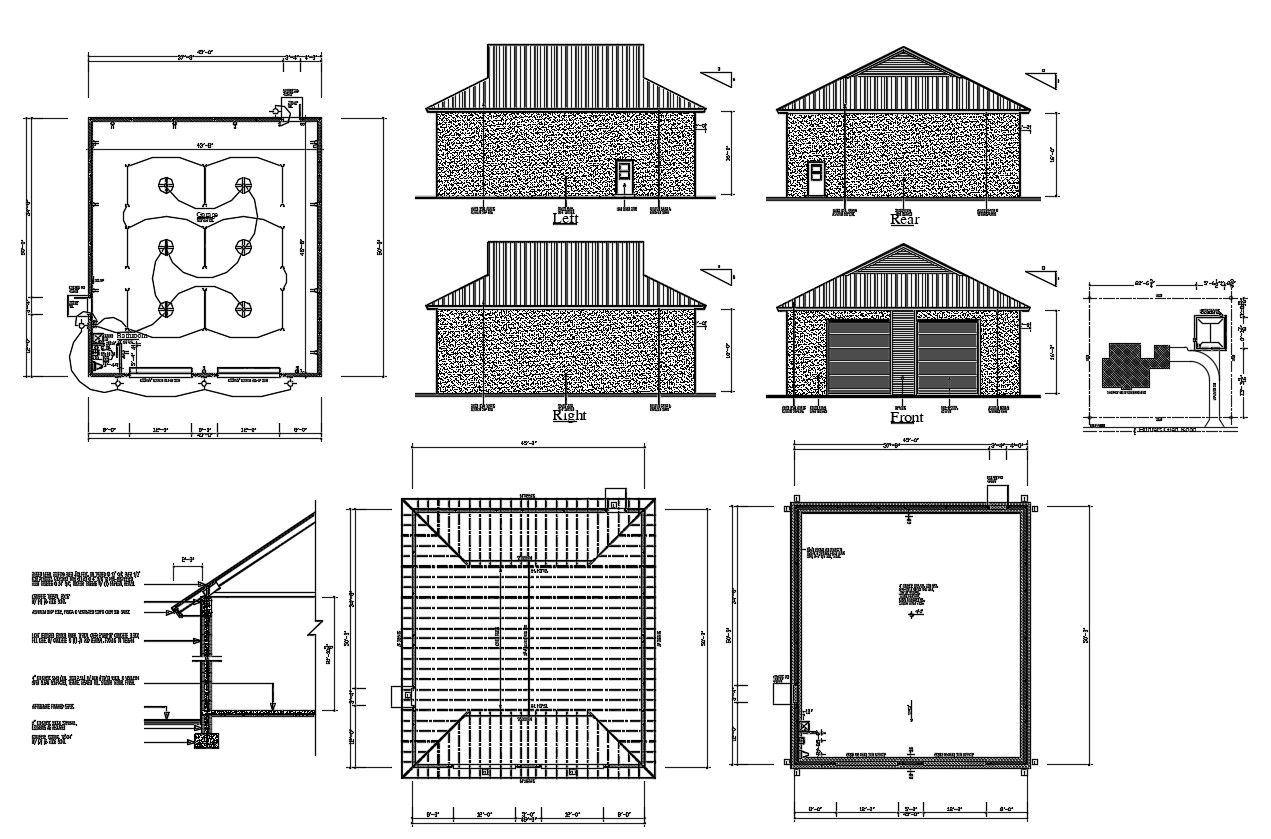 Garage House Plans DWG File; 2d CAD drawing of garage house plan includes electrical wiring layout, wall section, roof plan, site plan, and elevation design.