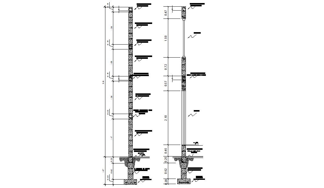 Wall structure section that shows wall pad footing design details along with slab structure, DPC work, concrete masonry and reinforcement bars detailing download CAD drawing for the detailed presented file.