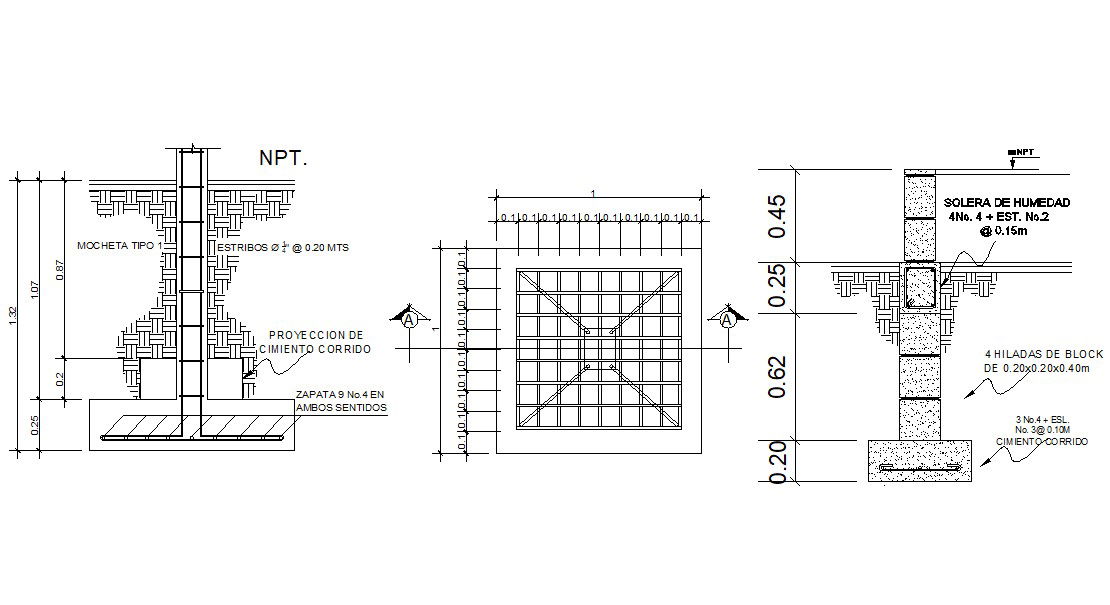 Foundation footing design structure that shows reinforcement details in tension and compression zone along with main and distribution hook up and bent up bars details, concrete masonry design, bar dimension, footing size, and various other structural blocks details download CAD drawing.