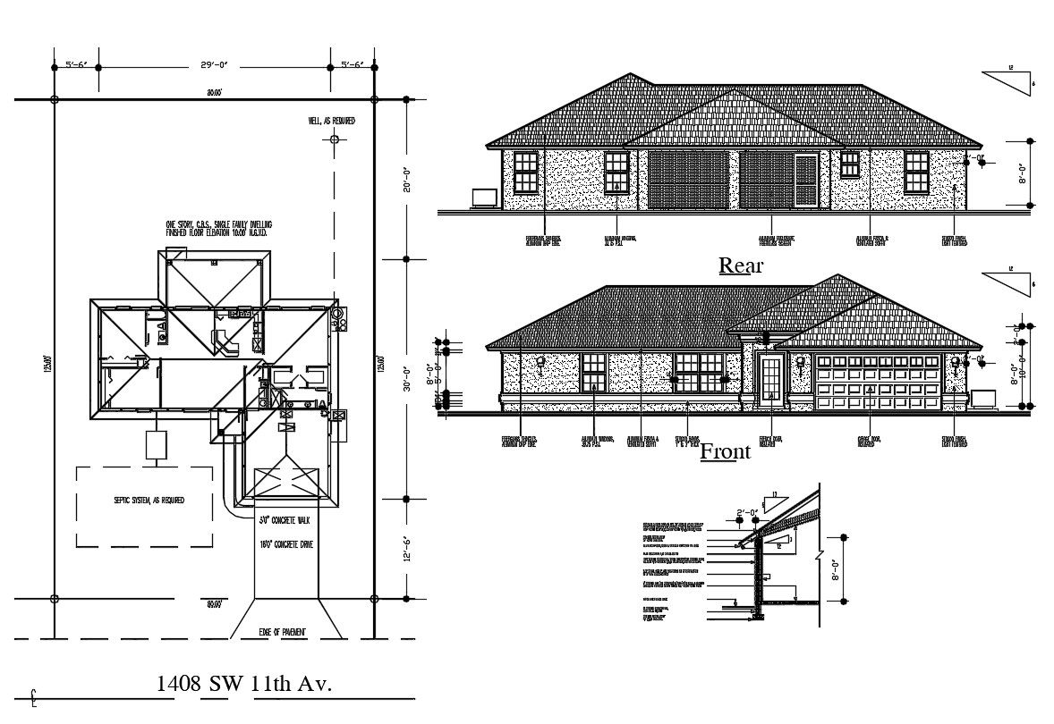 Single Family House Plan CAD Drawing; the architecture single-family house layout plan, wall with roof joint section drawing, rear, and front elevation design. download AutoCAD file and get all dimension detail mention in DWG file.