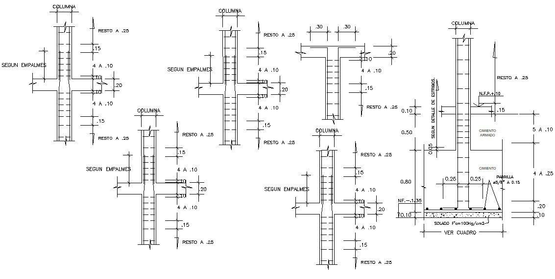 Column reinforcement design that shows reinforcement details in tension and compression zone along with main and distribution hook up and bent up bars details, column footing design, column dimension, and various other details download CAD drawing.