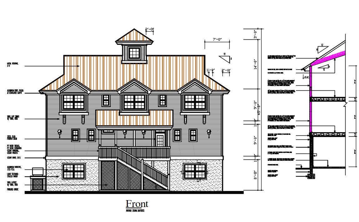 Architecture Bungalow Front Elevation DWG File; download AutoCAD file of architecture bungalow front elevation detail and wall section drawing with dimension detail.