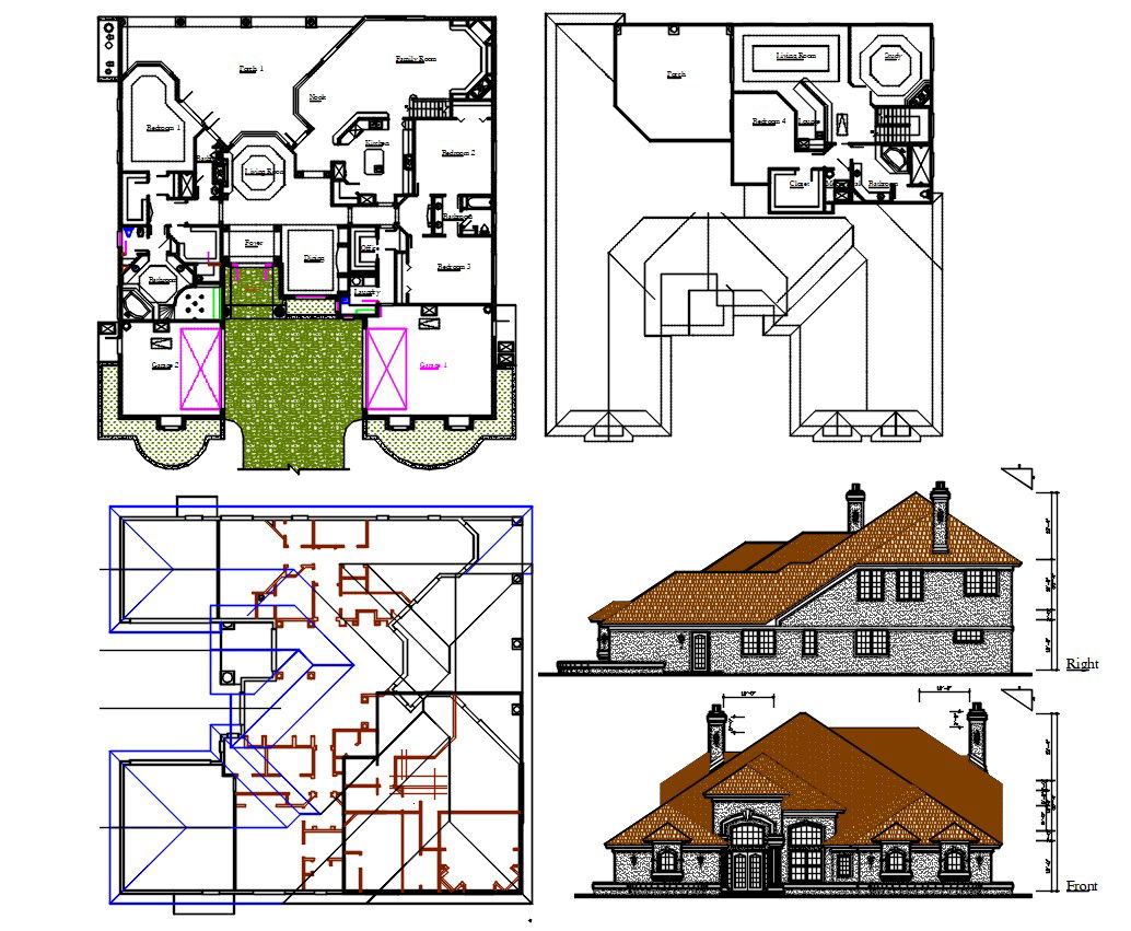 Architecture Bungalow Plan AutoCAD Drawing; the architecture 4 BHK bungalow layout plan of ground floor and first floor with roof plan. download AutoCAD file and get more detail in CAD drawing along with front elevation and right side elevation design.