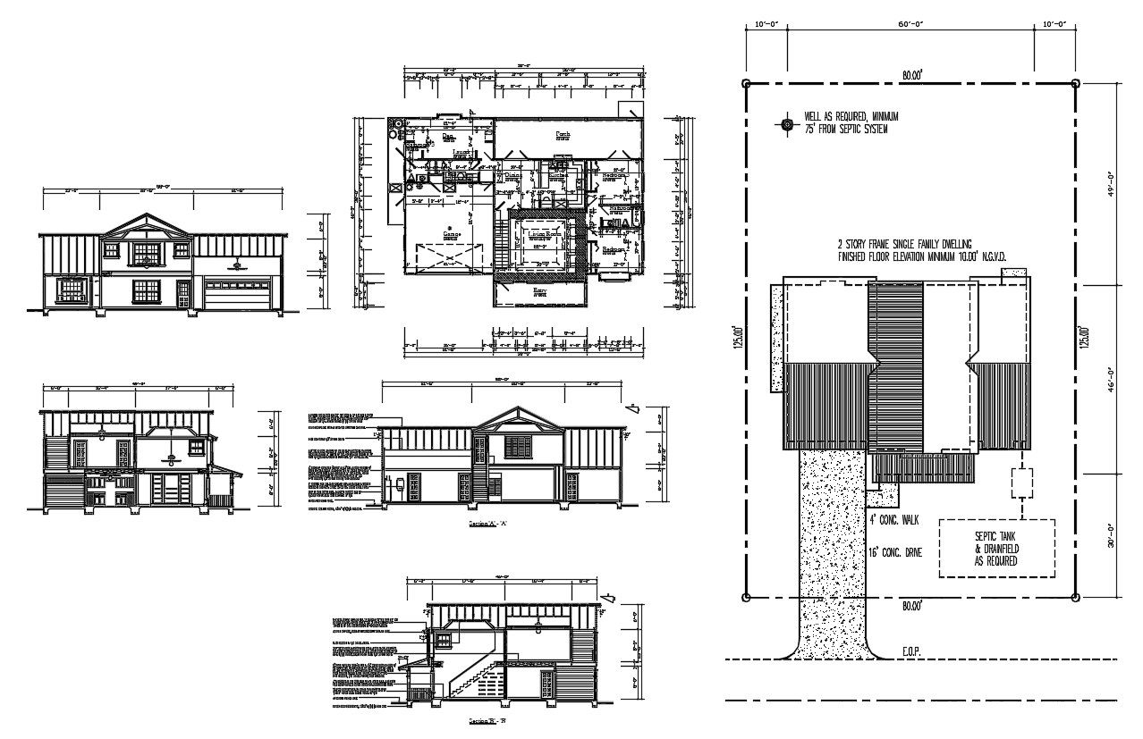 3 BHK House Plans AutoCAD File; the architecture house CAD drawing includes ground floor layout plan, section drawing and elevation design with all dimensions and description details.