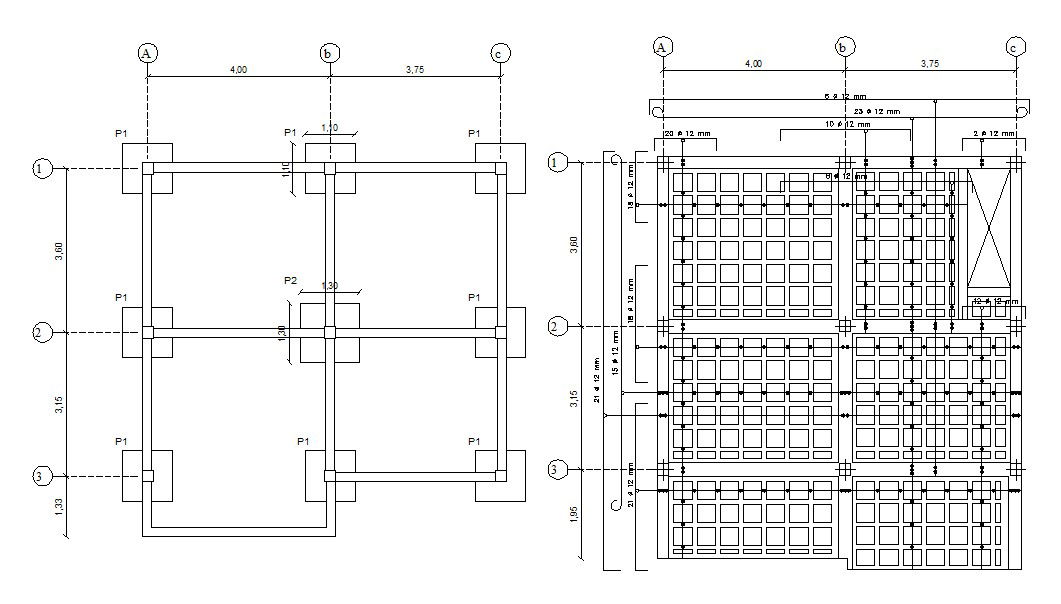 Foundation footing design plan that shows footing size and spacing details along with slab design, reinforcement bars details, bar dimension, and various other RCC structural blocks details download CAD drawing.