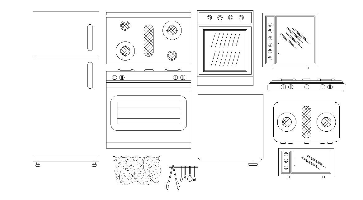 Kitchen automation blocks details of the refrigerator, gas stove, kitchen sink, oven elevation AutoCAD drawing download for free.
