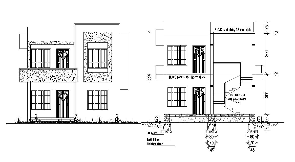 G plus1 Bungalow Elevation and Section CAD Drawing for Architects