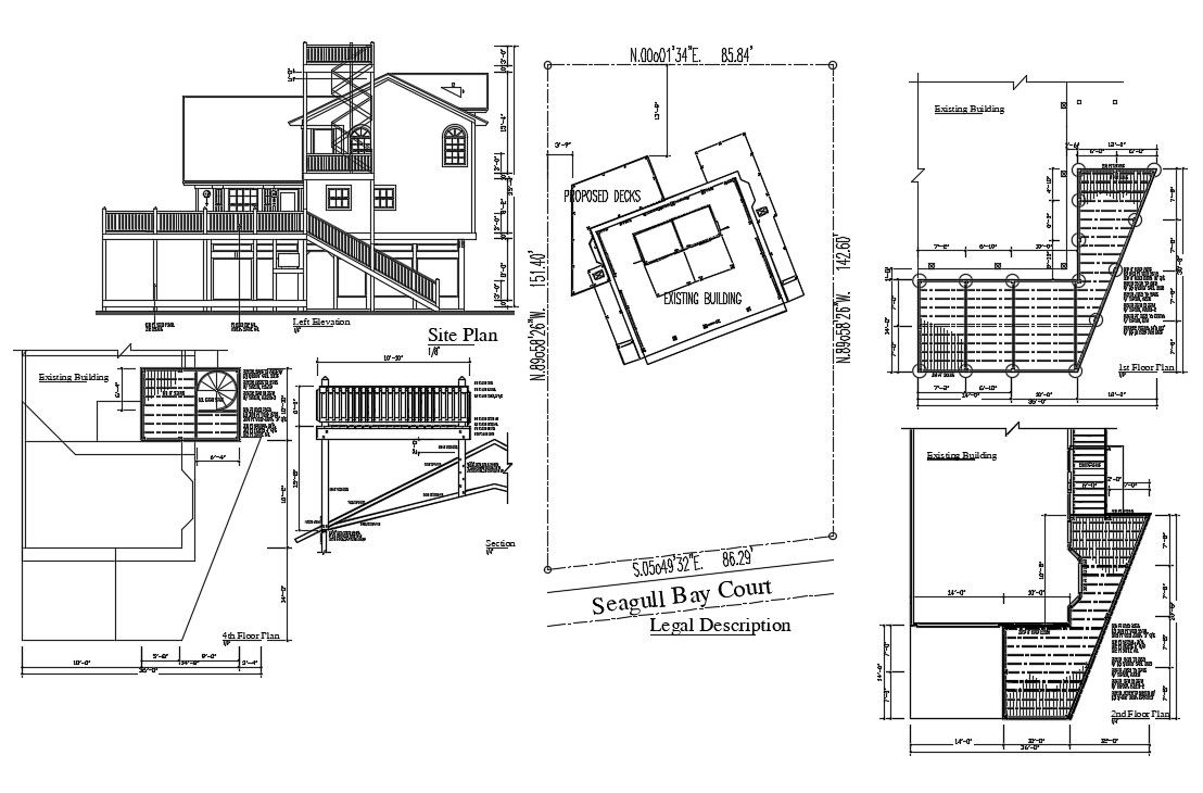 Exterior Home Plan DWG File; download AutoCAD file of exiting house site plan, side elevation design, first floor, and second-floor slab exterior design in CAD drawing.