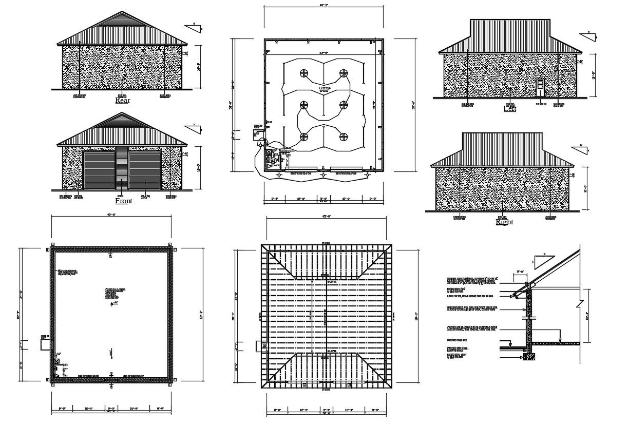 Warehouse Project AutoCAD Drawing; 2d CAD drawing of the warehouse floor plan, electrical layout plan, roof plan, wall section and elevation design with all dimension detail mention in CAD file.