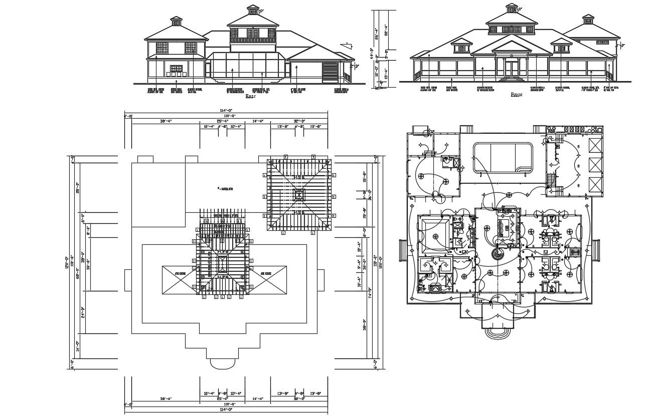 AutoCAD drawing details of residential housing bungalow front elevation and side elevation design along with roof terrace plan, house electrical wiring plan download CAD file.