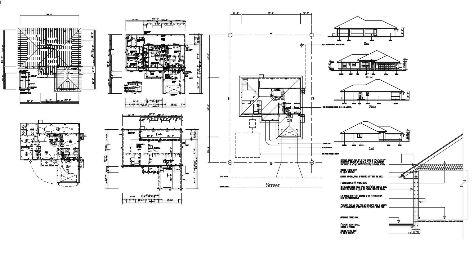 2d CAD drawing details of residential bungalow design that shows house electrical wiring plan, roof terrace plan, house working plan design, floor level, house different sides of elevation, roof section, and various other details download the file.