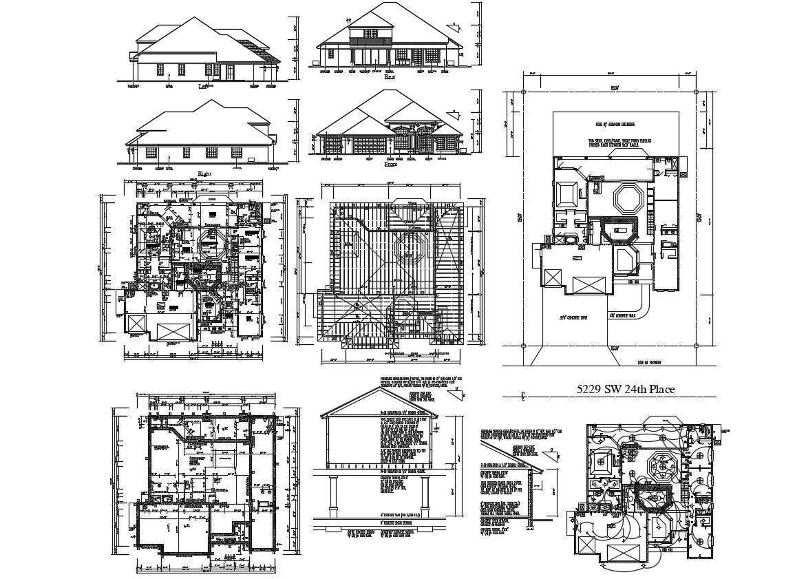 Residential housing bungalow different sides of elevation design along with house working plan, floor plan, electrical plan, column installation plan, roof plan, roof section, and various other details download CAD drawing.