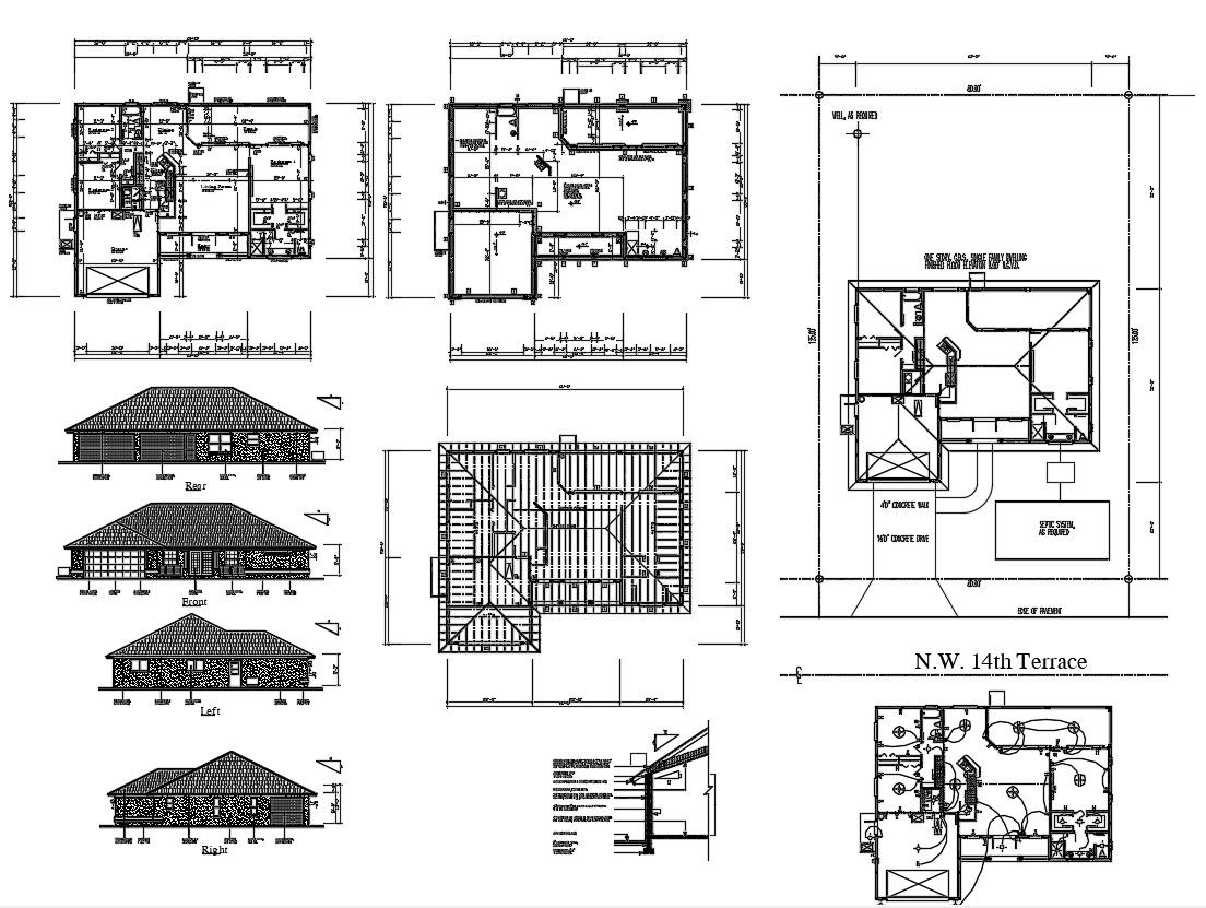 3 BHK Residence House Plan DWG File; the architecture residence house 3 BHK CAD drawing shows floor layout plan, electrical plan, terrace plan, roof plan, wall section, and all side elevation design which can be viewed from several angles