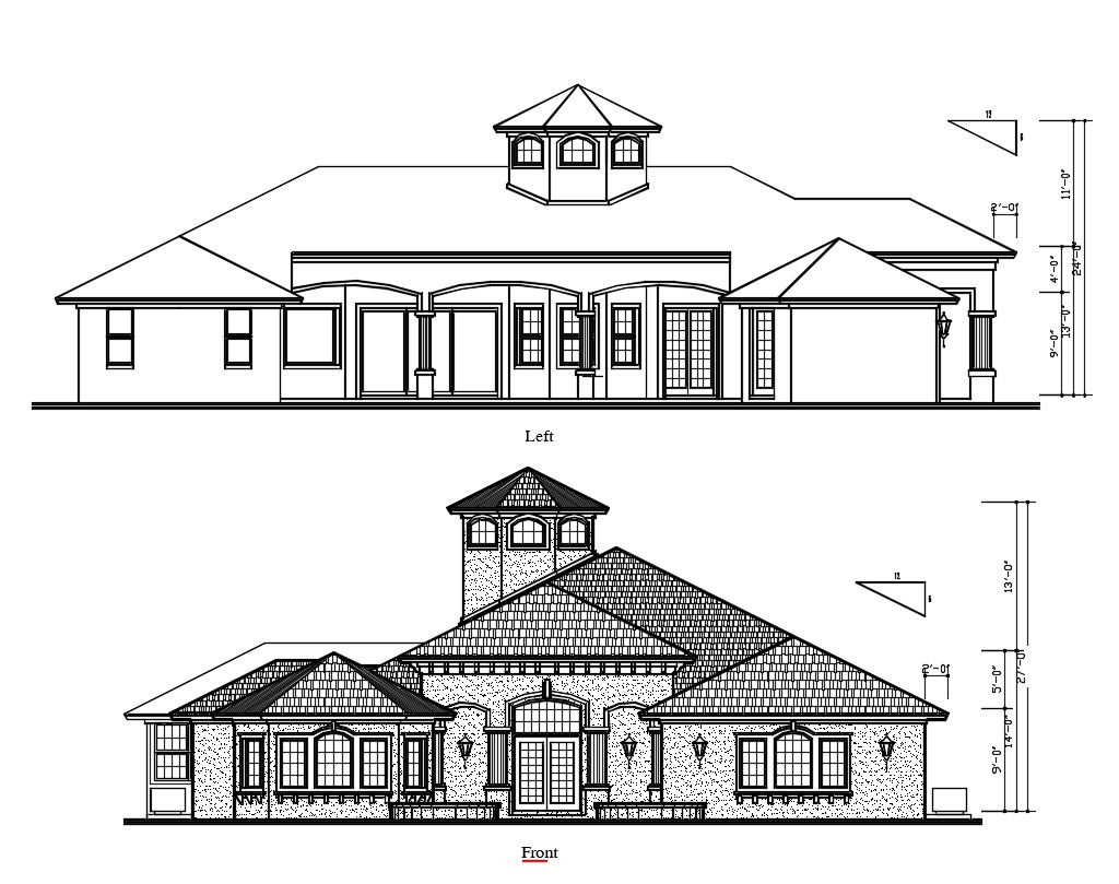 Residence House Elevation Design DWG File; 2d CAD drawing of residence house front elevation and lest side elevation design dimension details.
