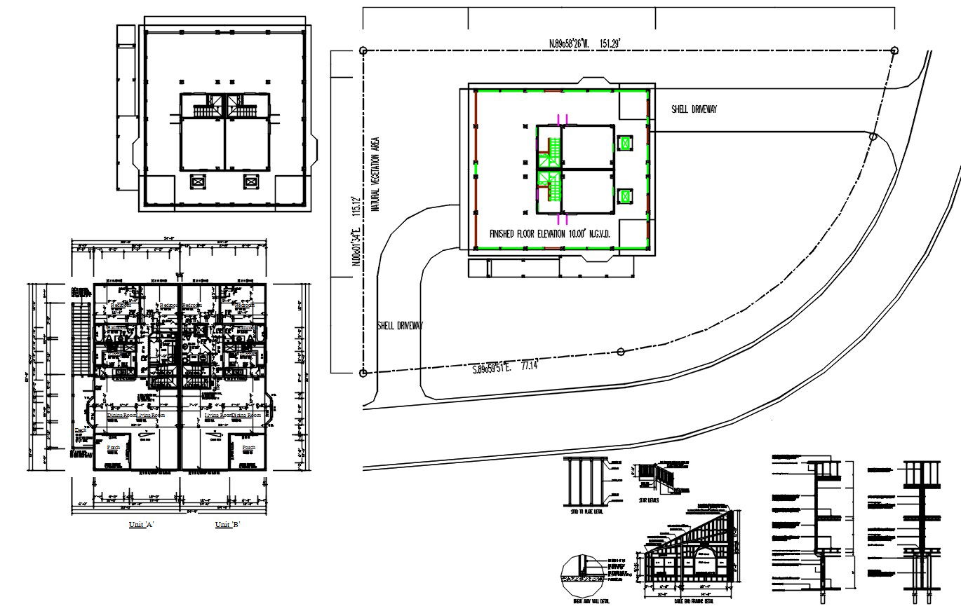 Joint House Project AutoCAD Plan; download DWG file of the site plan, layout floor plan, wall section, and roof structure CAD drawing with all dimension detail in AutoCAD format.