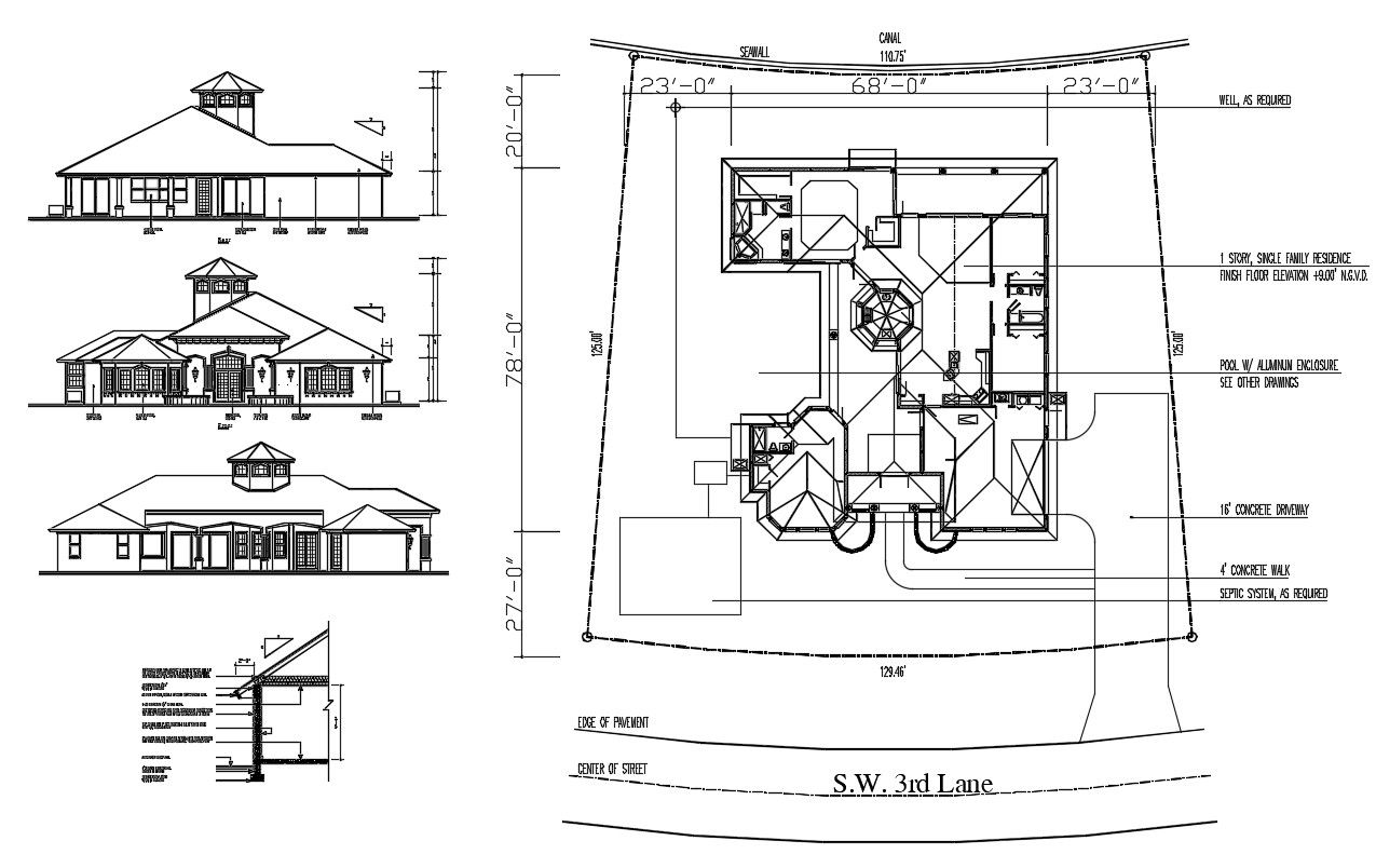 Truss Roof House Plan DWG File; download DWG file of architecture truss roof house plan CAD drawing includes roof plan, wall section and elevation design with dimension detail.