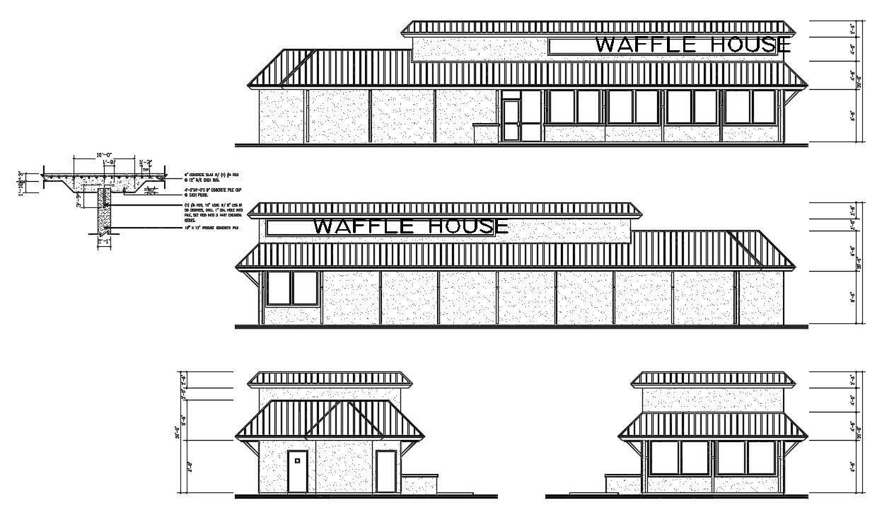 Waffle House AutoCAD File; download free AutoCAD file of Waffle House building elevation design with all dimension detail.