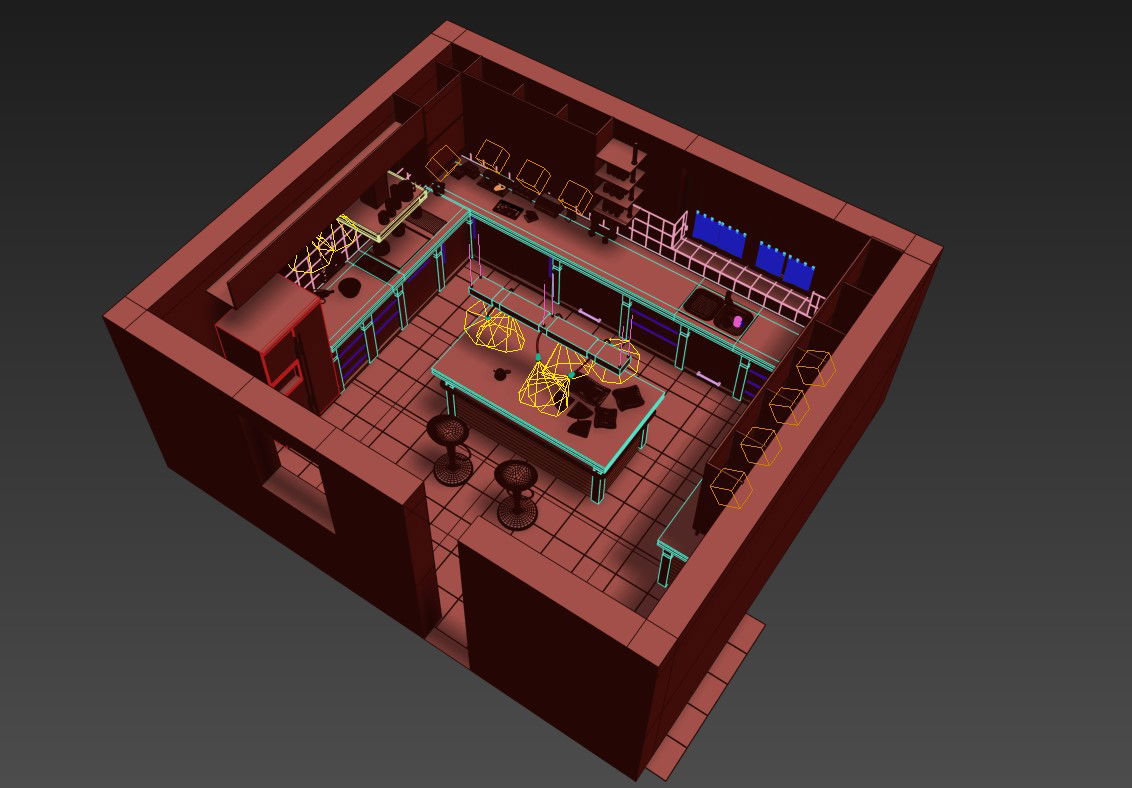 Top View Of Kitchen In 3D MAX File Free; this is the top view drawing of the kitchen with center gas hob, fully furnished cabinets, hanging lights, crockery units and much more detail in it 3D MAX File Free.