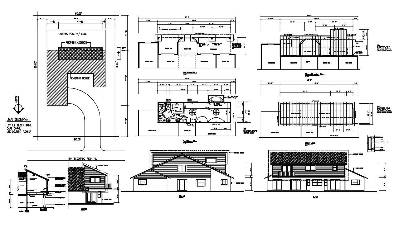 Single Storey House Plan DWG File; download DWG file of single storey house CAD drawing includes layout plan, electrical plan, roof plan, elevation design and wall section detail in AutoCAD format.