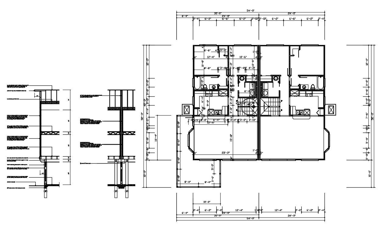 Twin House Layout Plan DWG File; the architecture twin house layout plan with all dimension detail and wall section CAD drawing.