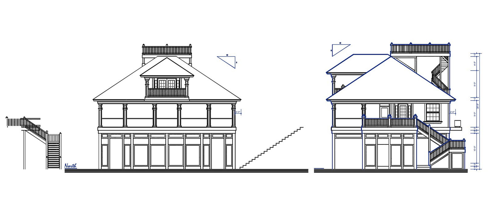 Residential bungalow front elevation and side elevation design along with building and floor height details, staircase details, floor level, and various other details download CAD drawing.