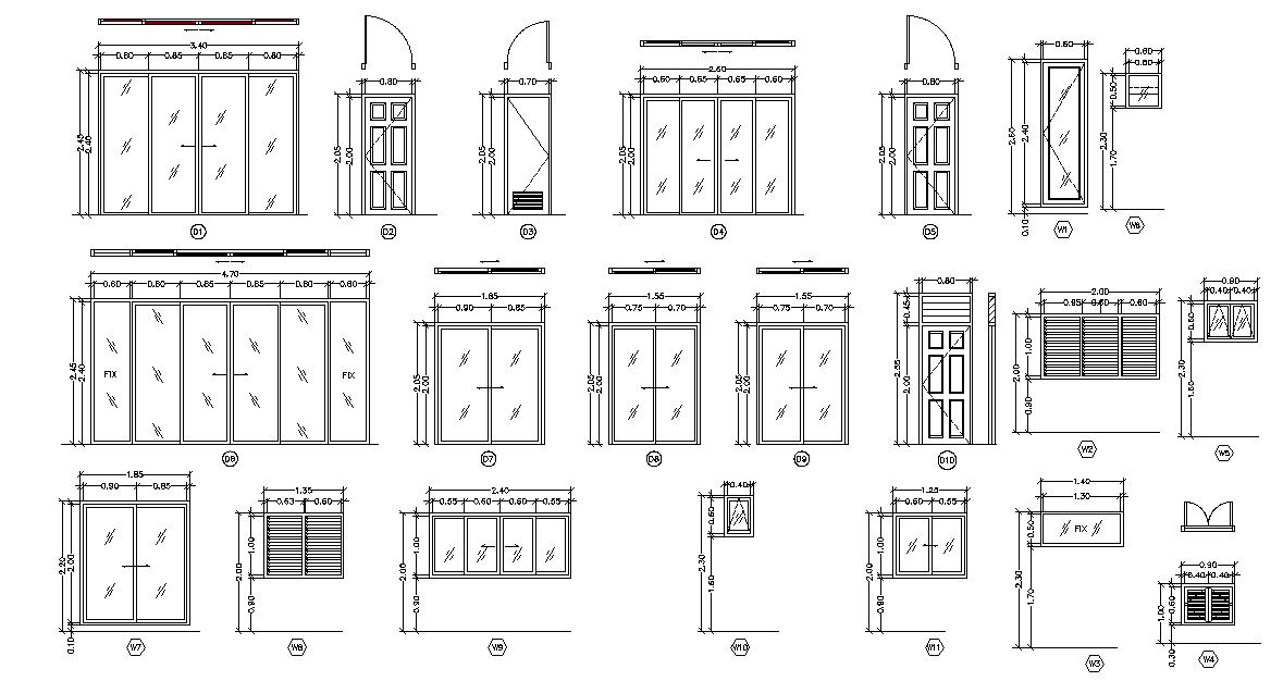 Elevation Of Door-Window CAD File Free; many types of door window elevation detail with dimension DWG file free.