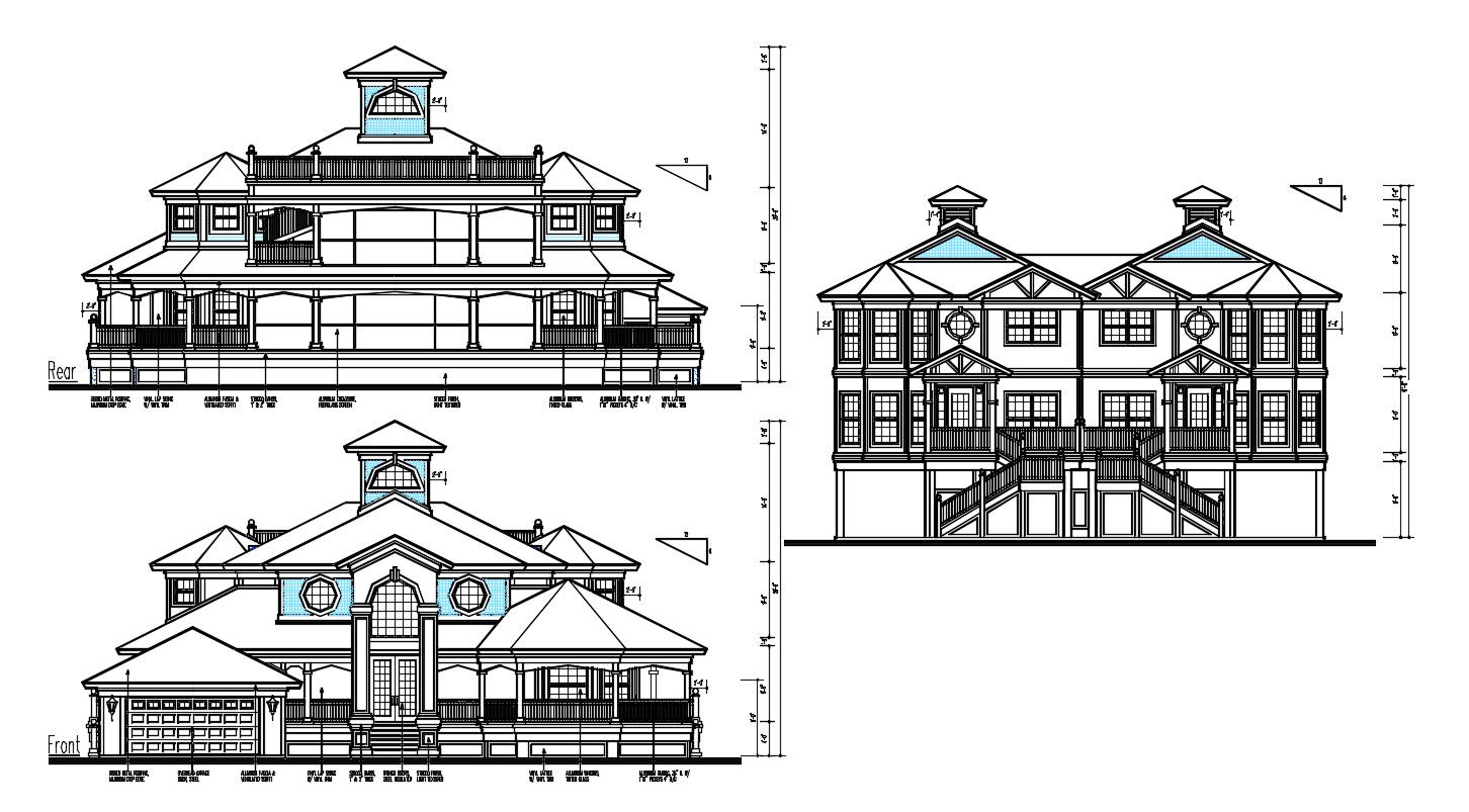 2d AutoCAD drawing details of residential bungalow different sides of elevation like front elevation side elevation and rear elevation along with house height and floor height details.